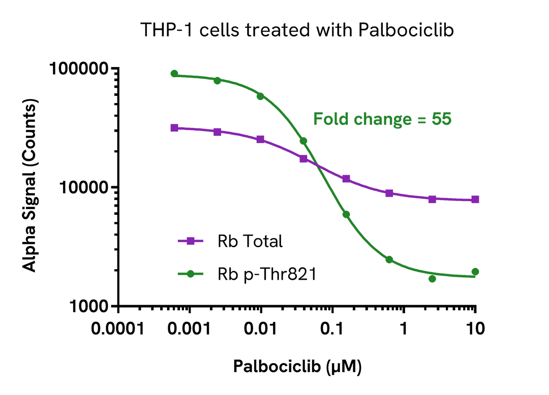 After treatment, the cells were lysed with the addition of 50 µL 5X Lysis Buffer for 10 minutes at RT with shaking (350 rpm). Rb Total and Phospho (Thr821) levels were evaluated using respective AlphaLISA SureFire Biotin Free assays. For the detection step, lysate was further diluted 1:2 with Lysis Buffer, 10 µL of cell lysate (approximately 4,000 cells) was transferred into a 384-well white OptiPlate, followed by 5 µL of Acceptor mix and incubated for 1 hour at RT. Finally, 5 µL of Donor mix was then added to each well and incubated for 1 hour at RT in the dark. The plate was read on an Envision using standard AlphaLISA settings.
