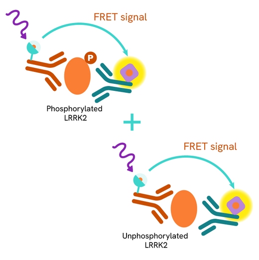 The Total LRRK2 assay quantifies the expression level of LRRK2 in a cell lysate. Unlike Western Blot, the assay is entirely plate-based and does not require gels, electrophoresis, or transfer. The Total LRRK2 assay uses two labeled antibodies, one coupled to a donor fluorophore and the other to an acceptor. Both antibodies are highly specific for a distinct epitope on the protein. In the presence of LRRK2 in a cell extract, the addition of these conjugates brings the donor fluorophore into close proximity with the acceptor and thereby generates a FRET signal. Its intensity is directly proportional to the concentration of the protein present in the sample and provides a means of assessing the protein's expression under a no-wash assay format.